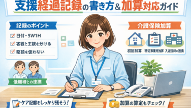 介護保険 支援経過記録の書き方ガイド|現場で迷わないための実践ポイント 支援経過記録の具体的な書き方と、加算要件に対応した記録のポイントを実務目線で解説。実地指導・減算対策にも役立つ内容です。 介護保険在宅サービス