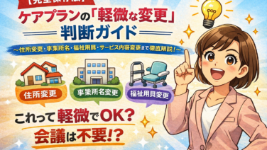 介護保険 【完全保存版】ケアプランの「軽微な変更」判断ガイド ケアプランの軽微な変更とは?サービス内容や福祉用具、住所変更など、実務で迷いやすいケースを具体例つきでわかりやすく解説します。 介護保険在宅サービス