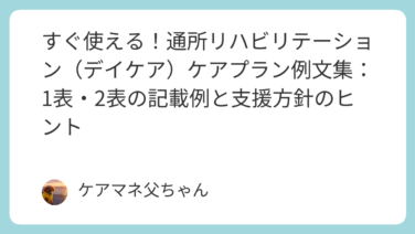 通所リハビリテーション(デイケア)のケアプラン作成に役立つ例文を多数掲載!1表・2表の記載例や支援方針のヒントも紹介。ケアマネジャー必見の実践的な内容です。
