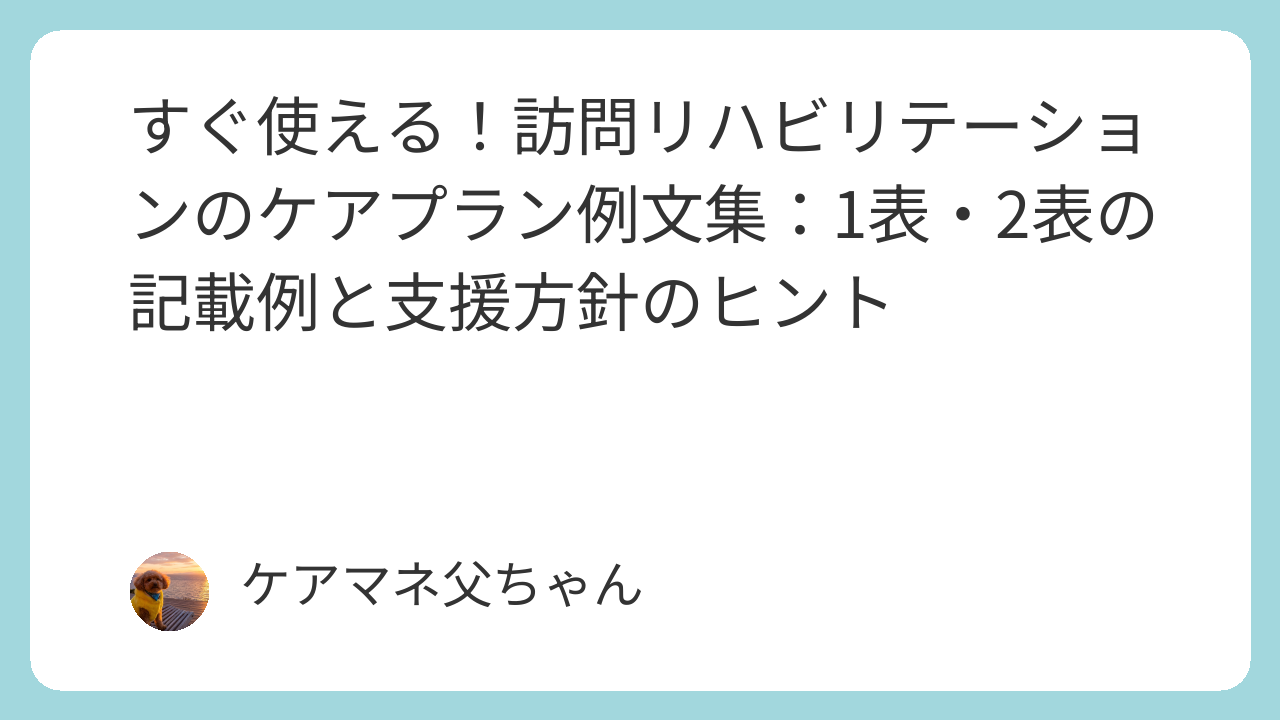 | 自宅で安全に生活したい | 転倒なく在宅生活を継続する | 屋内移動を安定させる | ・訪問リハビリ利用・バイタル確認・体調観察 |