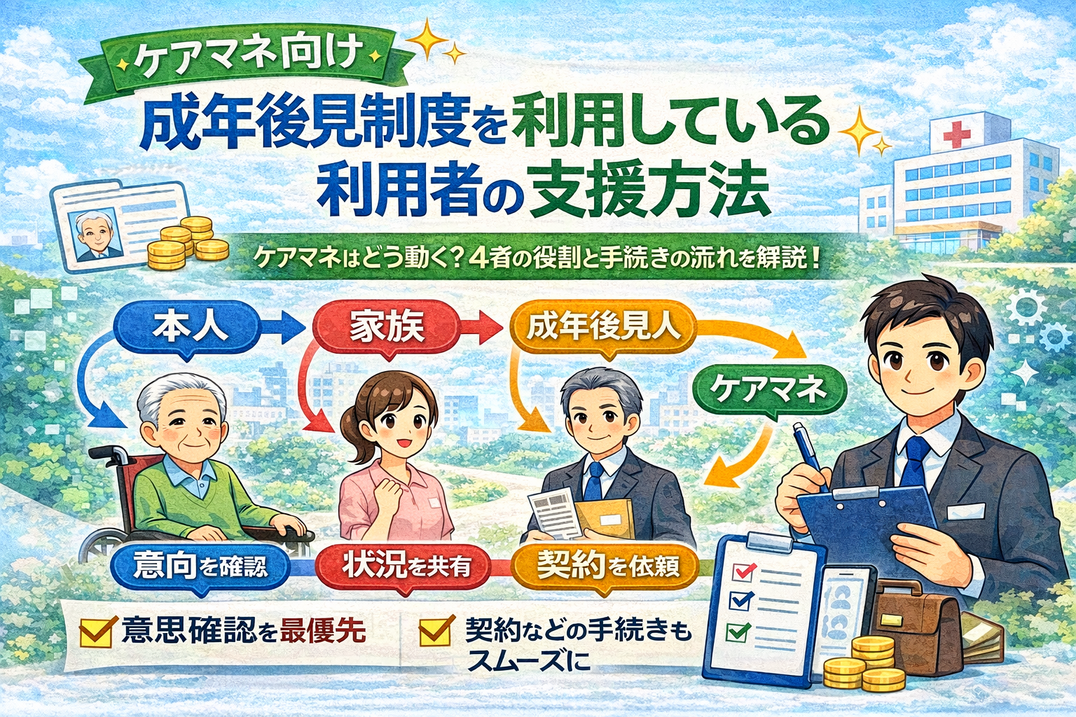 本人・家族・成年後見人・ケアマネの4者がそれぞれ異なる役割を持っています。