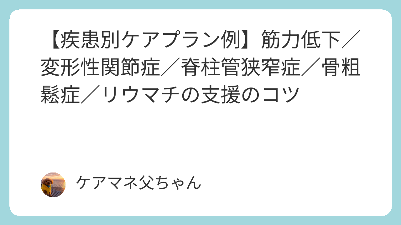 | 関節に負担をかけず、安全に歩いて家の中を移動したい。 | 屋内を安定して歩行でき、日常生活を大きな支障なく送ることができる。 | 痛みをコントロールしながら、手すりや補助具を使用して安全に移動できる。 | ・歩行時の見守り、動作時の声かけ → 訪問介護:週2回・手すり設置、歩行器・杖の導入 → 福祉用具貸与・関節に負担をかけない歩行訓練 → 通所介護(機能訓練):週1回 |