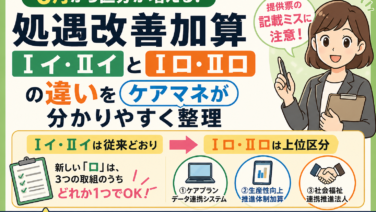 加算 【6月から区分が増える】処遇改善加算Ⅰイ・Ⅱイ/Ⅰロ・Ⅱロの違いをケアマネが分かりやすく整理|提供票の記載ミスに注意 処遇改善加算1イ・2イは従来どおりですが、1ロ・2ロが新設されます。6月以降の利用票・提供票では加算区分の確認が必須。ケアマネ視点で、ロで必要な3つの取組と実務の注意点を分かりやすく整理します。 加算