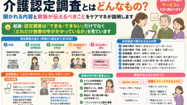 介護認定調査では、どんなことを聞かれ、何を見られているのでしょうか。寝たきりや認知症の方でも、本人への聞き取りが基本ですが、トイレや認知症の様子は家族の説明がとても大切です。ケアマネの経験をもとに、認定調査の内容と家族が押さえたいポイントを分かりやすくまとめました。